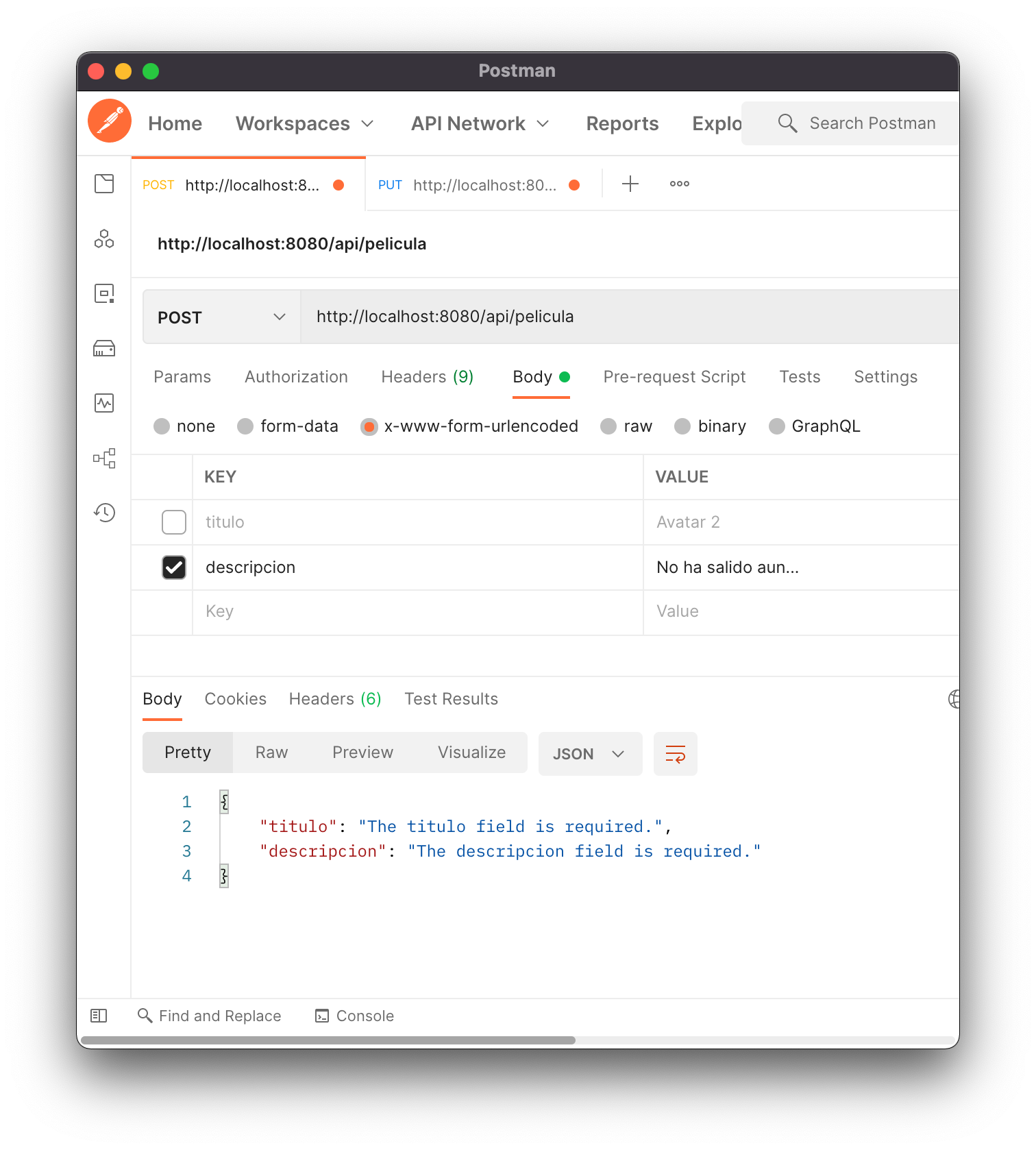 }Aquí como puedes ver, estamos empleando una categoría ya que una movie pertenece a una categoría por lo tanto validamos que la misma exista, y si no existe simplemente devolvemos una respuesta de error.